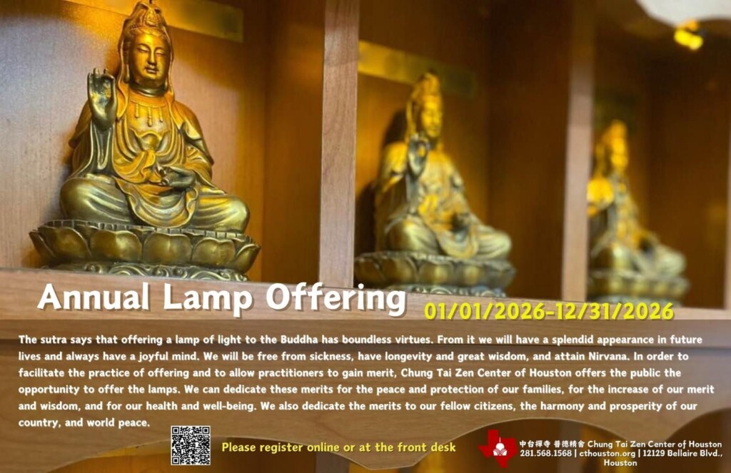 You can light a lamp in your name (or a name of your choice) for a period of time (Year long lamp offering: from 1/1/2026 to 12/31/2026). This is a great opportunity for us to clear away karmic obstacles, support the precious teaching of the Dharma, and honor the Buddha. Let us all participate in this illuminating and worthy endeavor.